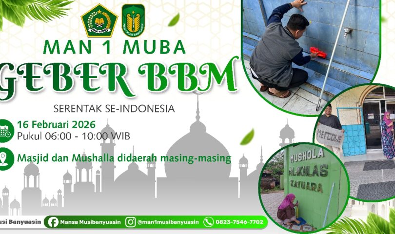 Sekayu, (Mansa Muba) — MAN 1 Musi Banyuasin melaksanakan kegiatan GEBER BBM (Gerakan Bersih-Bersih Masjid) yang dilaksanakan pada hari Senin, 16 Februari 2026, mulai pukul 06.00 hingga 10.00 WIB. Kegiatan ini diikuti oleh seluruh tenaga kependidikan, pendidik, serta siswa-siswi MAN 1 Musi Banyuasin yang dilaksanakan di masjid dan mushala di daerah masing-masing serta di lingkungan MAN 1 Musi Banyuasin. Senin, (16/02/2026).