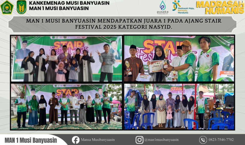 Sekayu, (MANSa Muba) – MAN 1 Musi Banyuasin kembali menorehkan prestasi membanggakan pada ajang STAIR Festival 2025 dengan meraih Juara 1 kategori Nasyid. Kompetisi ini diselenggarakan oleh Sekolah Tinggi Agama Islam Rahmaniyah Sekayu sebagai wadah pengembangan bakat seni islami bagi pelajar tingkat sekolah menengah. Rabu, (10/12/2025).