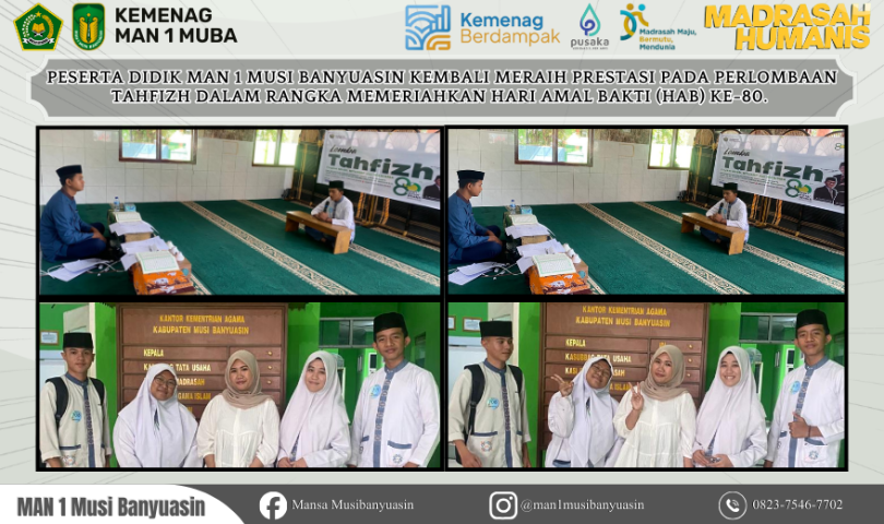 Sekayu, (MANSa Muba) – Salah satu perwakilan Peserta Didik MAN 1 Musi Banyuasin kembali Meraih prestasi Pada Perlombaan Tahfizh Yang Di Adakan Oleh Kementerian Agama Kabupaten Musi Banyuasin Dalam Rangka Memeriahkan Hari Amal Bakti Ke-80. M. Faturrahman meraih juara 1 pada perlombaan Tahfizh tersebut. Perlombaan ini juga di ikuti oleh tingkat SD/MI, SMP/MTS, SMA/SMK/MA Se-kabupaten Musi Banyuasin. Perlombaan ini berlangsung di kantor Kementerian Agama (Kemenag) Kabupaten Musi Banyuasin. Selasa,(16/12/2025).