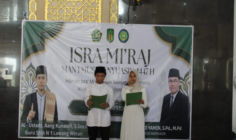 Sekayu, (MANSa Muba) – MAN 1 Musi Banyuasin Menggelar kegiatan peringatan Isra Mi’raj 1447 Hijriah yang di ikuti oleh seluruh guru dan pegawai serta seluruh peserta didik dari kelas X, XI, dan XII. Kegiatan dimulai dari pukul 07.00 Wib s/d selesai. Kegiatan ini bertempat di Masjid Raya Baitul Makmur. Peringatan Isra Mi’raj kali ini mengusung tema Hikmah Isra Mi’raj Dalam Menjaga Konsistensi Imam Di Masa Turbulenzi Zaman. Selasa,(20/01/2026).